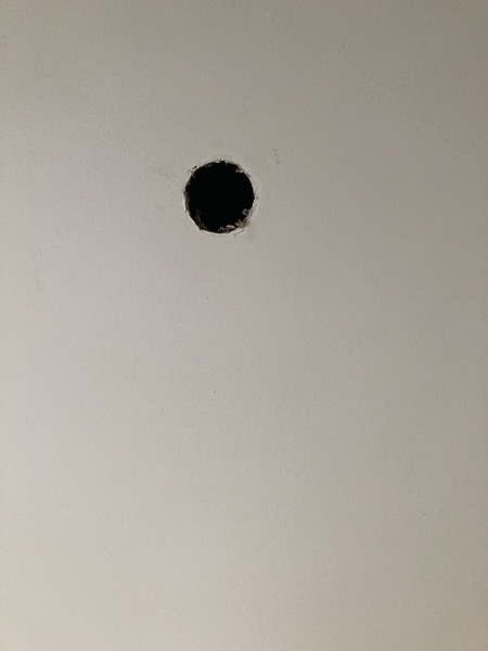 We have 4 downlight holes and one smaller hole that needs to be plastered, patched and smoothed out to prepare for painting.