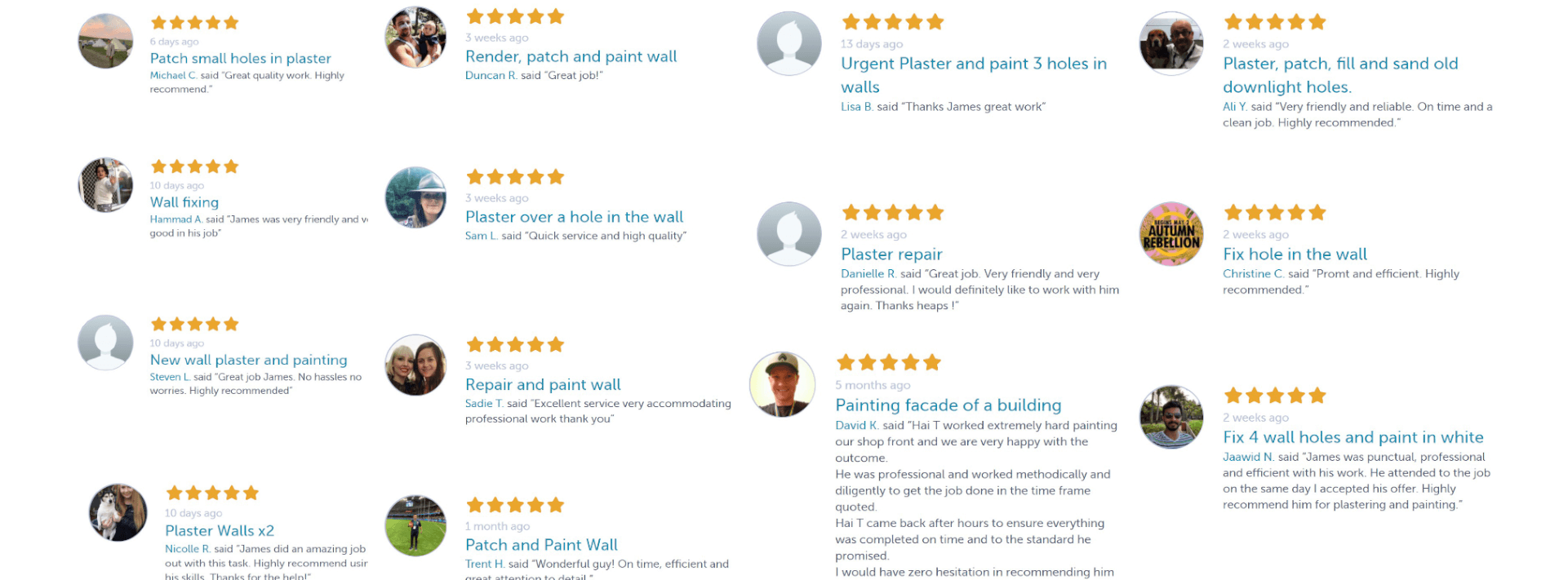 James did an amazing job. Not only did he fix the hole, he went above and beyond, matched the paint and re-painted the wall. Looking at it, you would never guess there had ever been any damage. Would higly recommend.